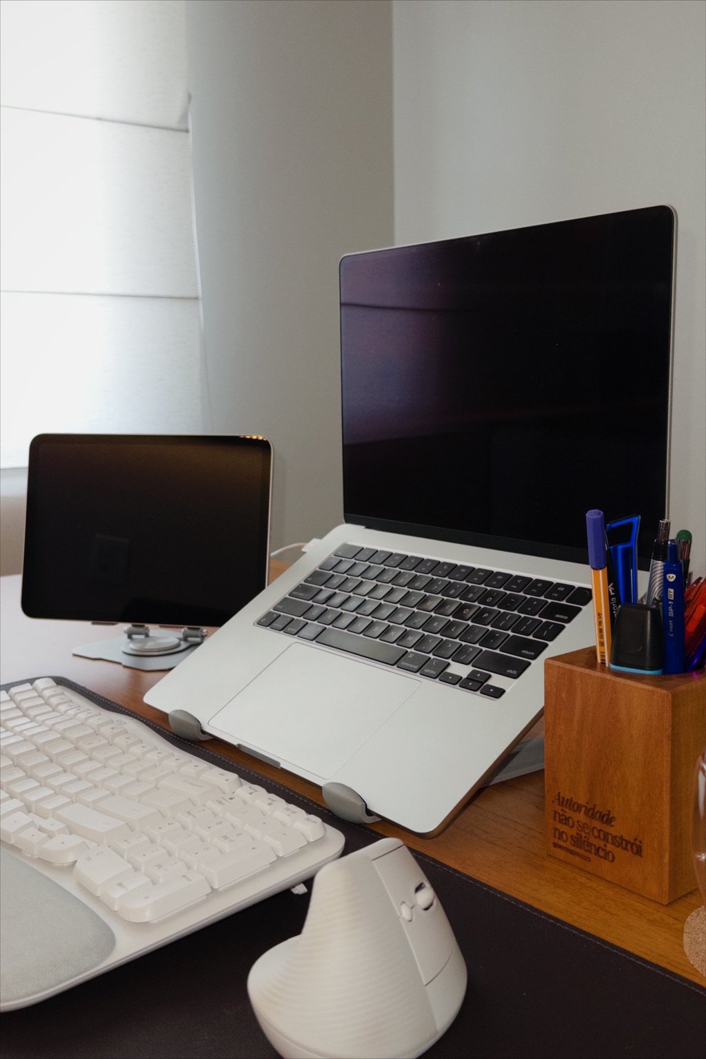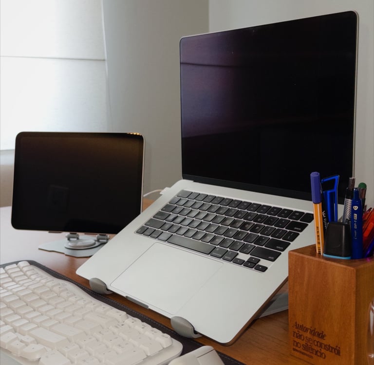 Uso esse suporte para deixar o notebook na altura dos olhos, o que melhora muito a postura durante o trabalho. Além disso, ajuda a organizar melhor a mesa e deixa o setup mais limpo e funcional.