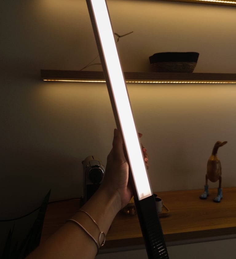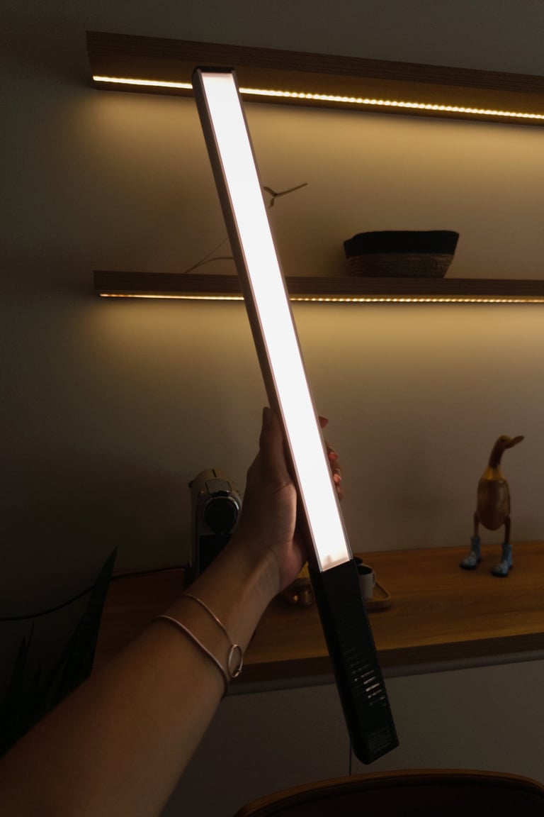 Uso esse bastão de luz para melhorar a iluminação dos meus vídeos e também para criar um ambiente mais bonito.